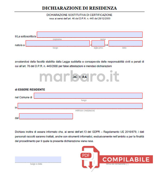 Modulo autocertificazione residenza editabile da stampare
